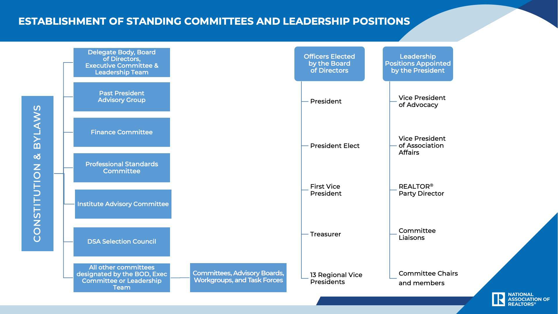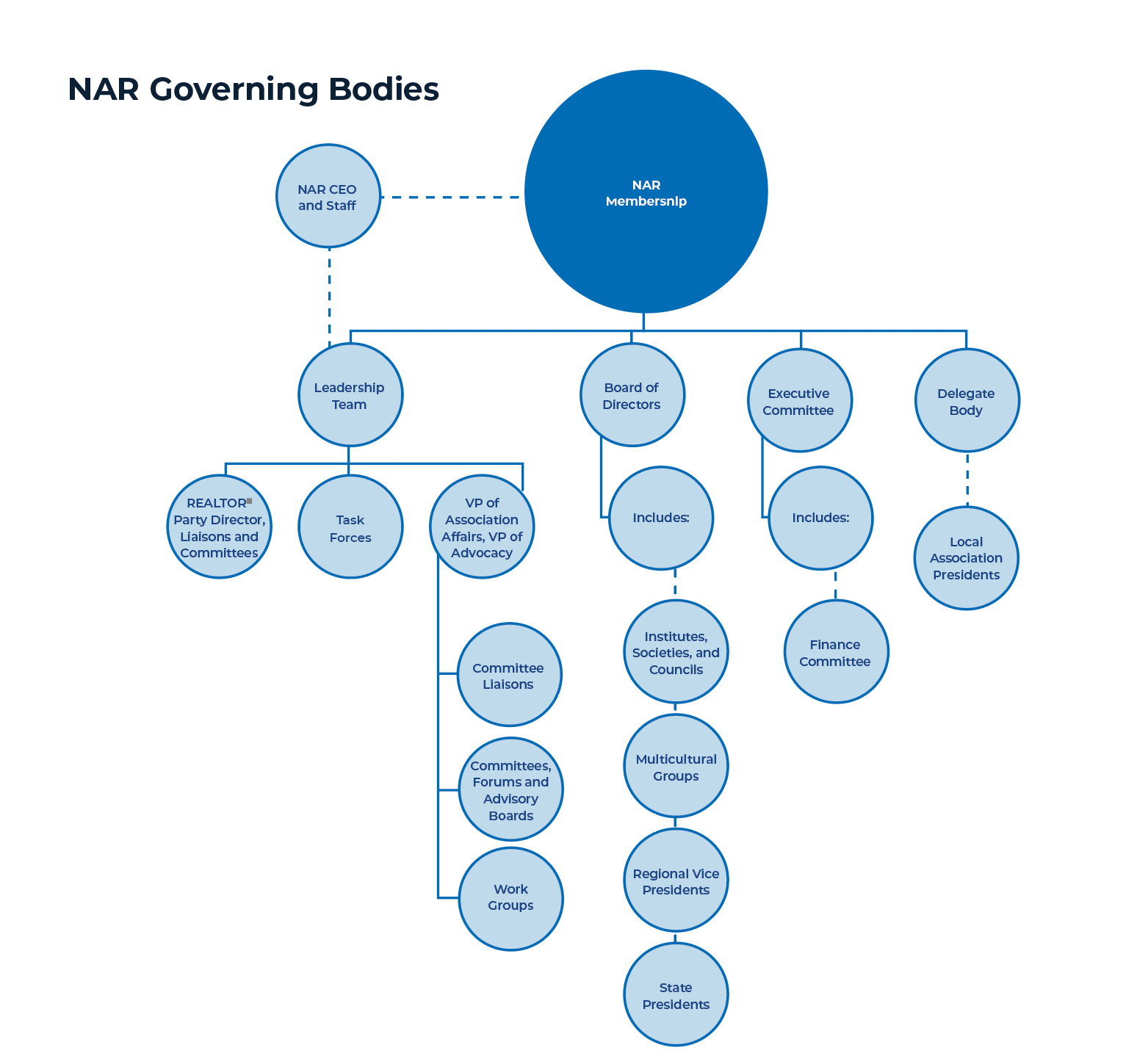 Welcome to a distinguished team of NAR committee leaders! As you can imagine, there is a tremendous amount of work that goes on behind the scenes, among several governing bodies, to ensure that our organization functions efficiently and effectively. To help you feel as prepared as possible heading into your year as a committee leader, this page provides everything from an overview of governing bodies, to what to expect at a Board of Directors meeting, and oversight diagrams so you can better understand the roles and responsibilities in each area of NAR. You’ll even find scripts and tips to help in the event that you need to bring a recommendation forward to Executive Committee or the Board of Directors.
