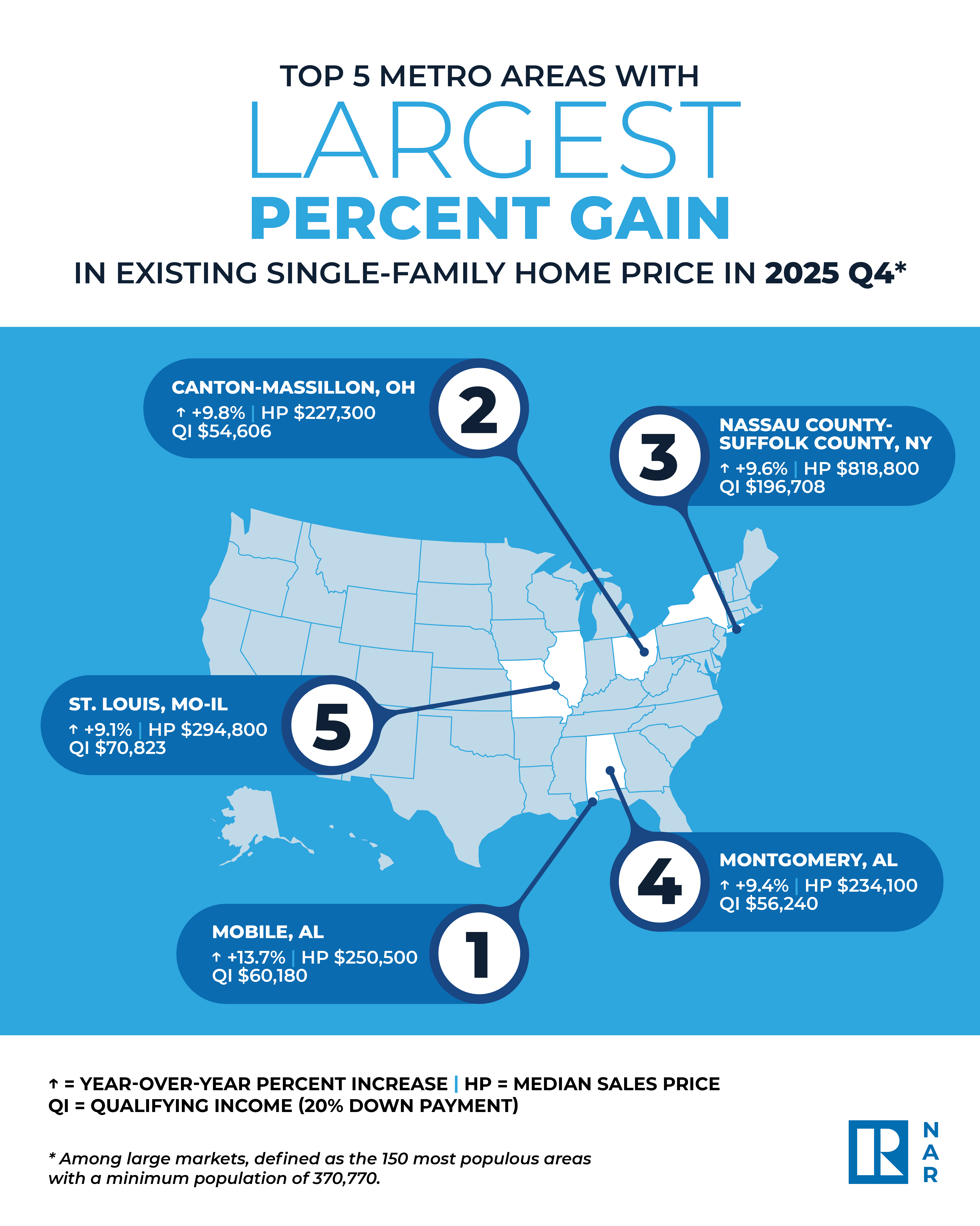 WASHINGTON (February 4, 2026) – Home prices rose in 73% of metro markets (168 out of 230) during the fourth quarter of 2025, according to the National Association of REALTORS®’ latest quarterly report. This is down from 77% in the third quarter. Five percent of metro areas (12 out of 230) recorded double-digit price gains, up slightly from 4% last quarter. The report provides the real estate ecosystem—including agents and homebuyers and sellers—with quarterly metro-area data on median home prices and housing affordability.