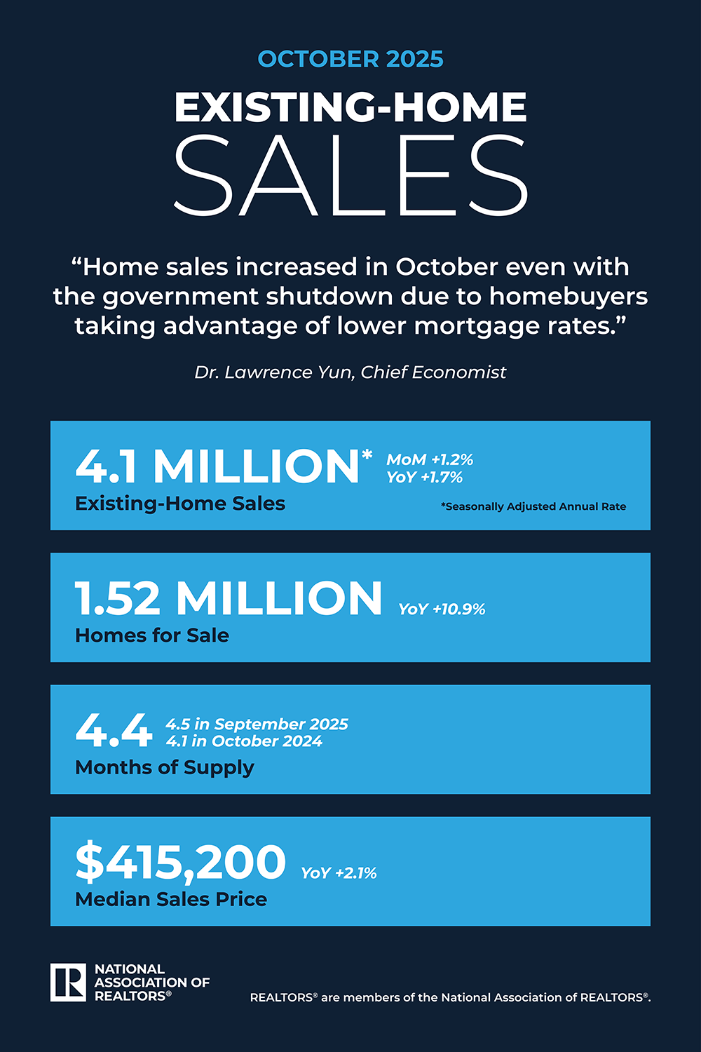 WASHINGTON (November 20, 2025) – Existing-home sales increased by 1.2% in October, according to the National Association of REALTORS® Existing-Home Sales Report. The Report provides the real estate ecosystem, including agents and homebuyers and sellers, with data on the level of home sales, price, and inventory.