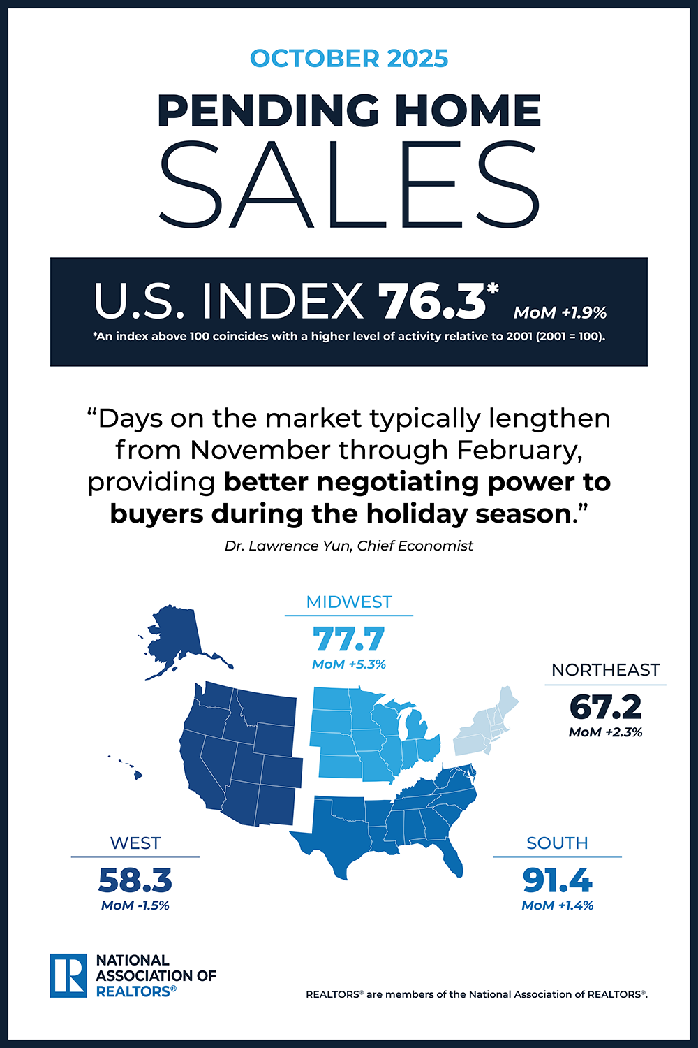 WASHINGTON (November 25, 2025) – Pending home sales in October increased by 1.9% from the prior month and fell 0.4% year over year, according to the National Association of REALTORS® Pending Home Sales Report. The report provides the real estate ecosystem, including agents and homebuyers and sellers, with data on the level of home sales under contract.