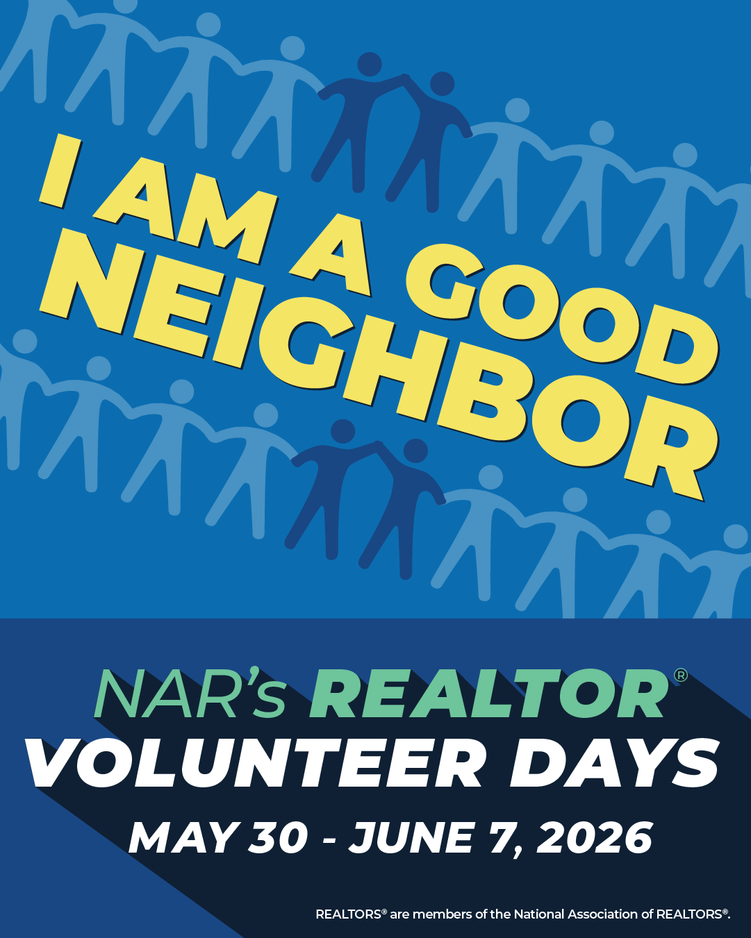Encourage your members, agents, and/or colleagues to join your efforts by sharing the graphics below on your social media pages with details about your event. Add #RealtorsAreGoodNeighbors and #RealtorVolunteerDays to your posts to showcase your association’s participation REALTOR® Volunteer Days.