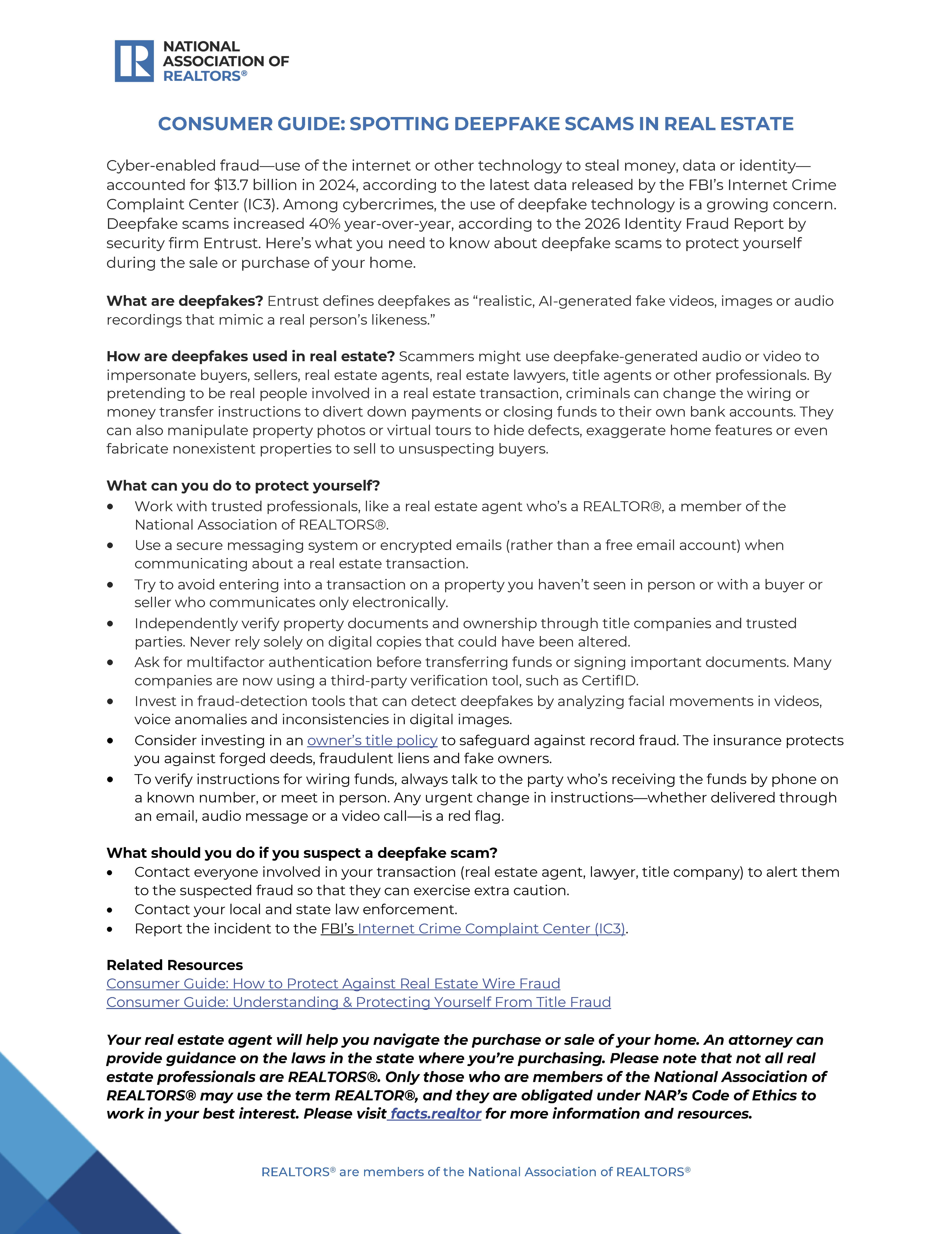 Cyber-enabled fraud—use of the internet or other technology to steal money, data or identity—accounted for $13.7 billion in 2024, according to the latest data released by the FBI’s Internet Crime Complaint Center (IC3). Among cybercrimes, the use of deepfake technology is a growing concern. Deepfake scams increased 40% year-over-year, according to the 2026 Identity Fraud Report by security firm Entrust. Here’s what you need to know about deepfake scams to protect yourself during the sale or purchase of your home.
