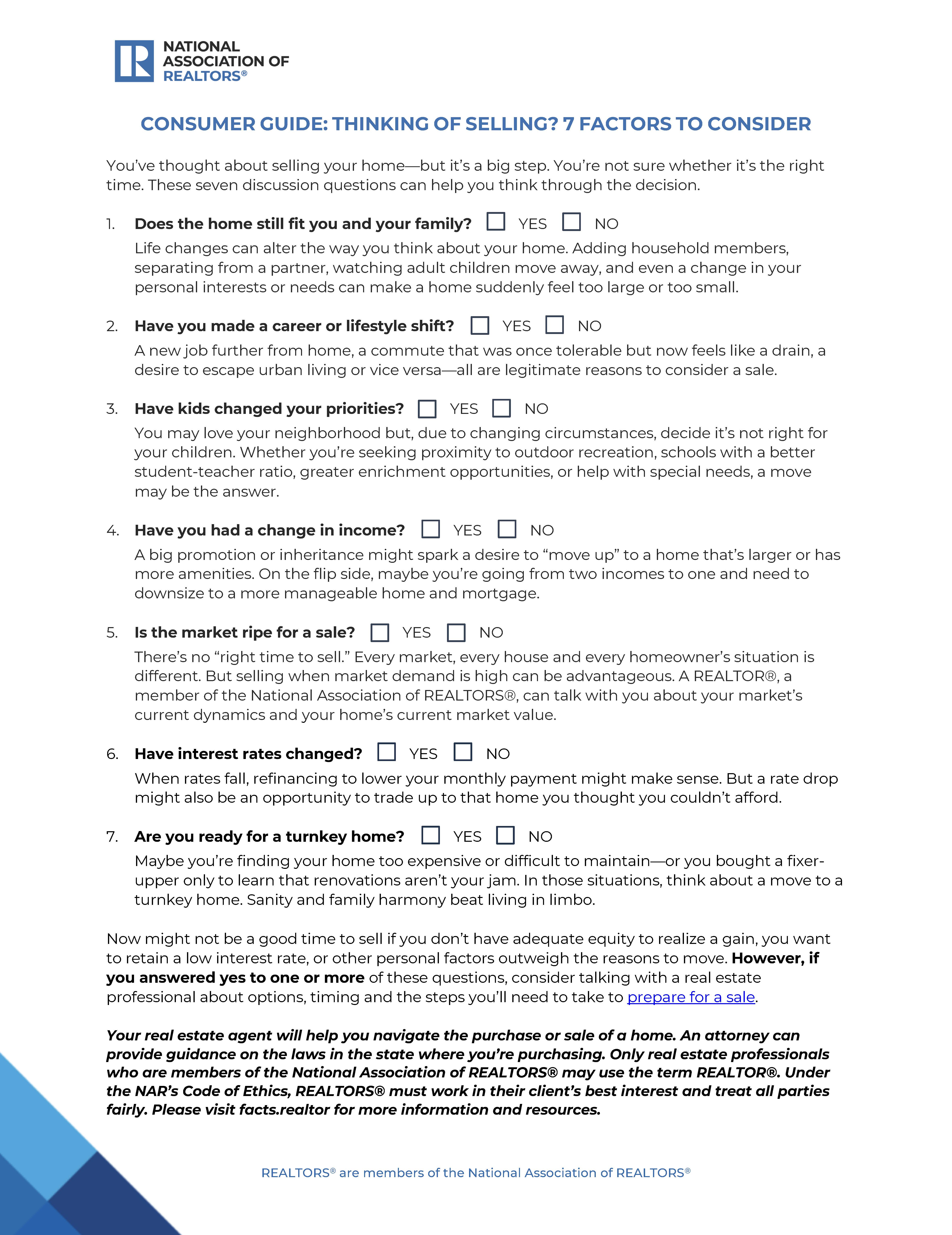 You’ve thought about selling your home—but it’s a big step. You’re not sure whether it’s the right time. These seven discussion questions can help you think through the decision.